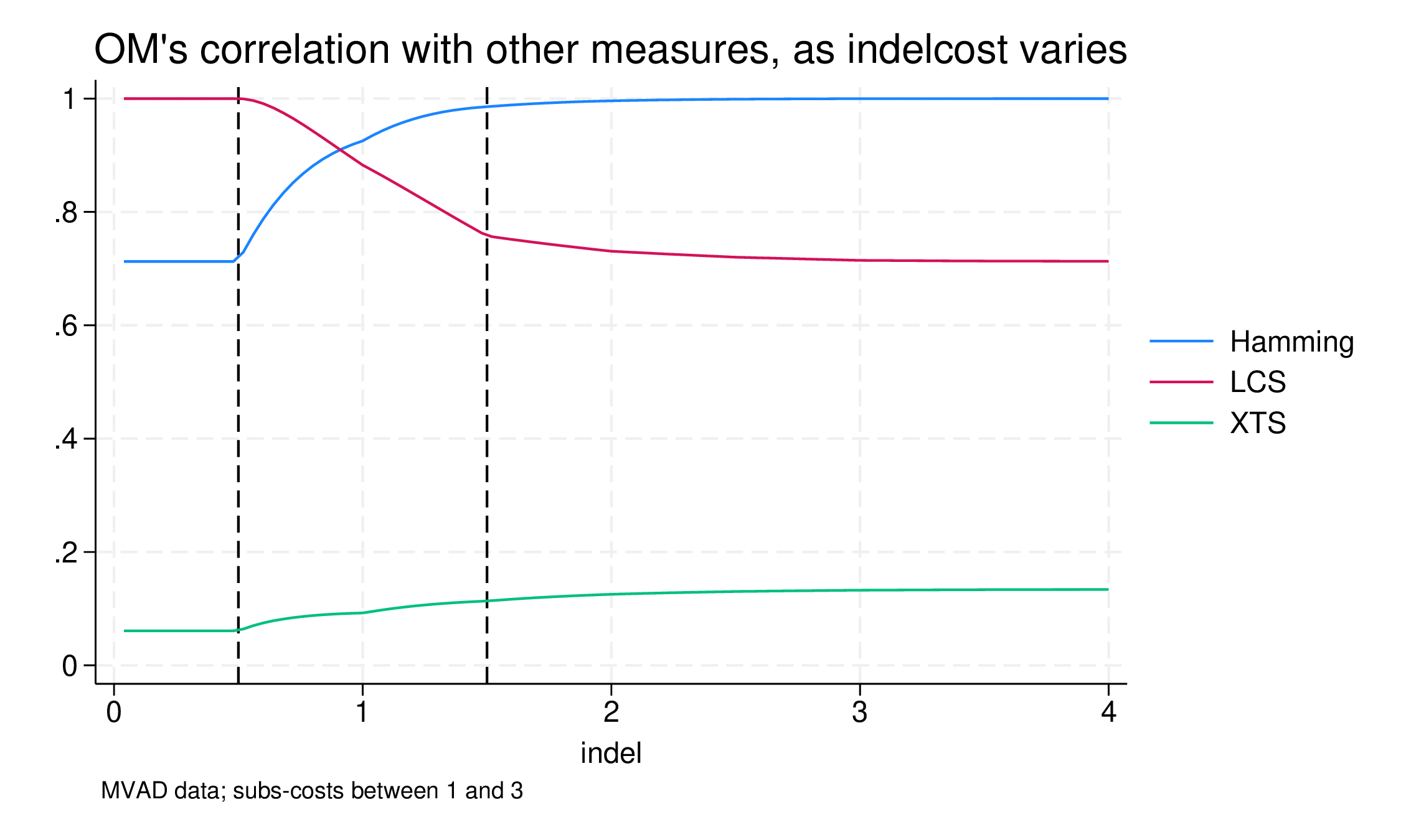 How do you parameterise Optimal Matching analysis of lifecourse sequence data? A lot of ink has been spilt on how to build the substitution matrix, defining the differences between the states through which sequences move (the cost of substituting elements), but what about the role of indelcost, the cost of inserting or deleting elements? Here is a quick demonstration (using SADI, in Stata) that shows that below a certain threshold OM becomes LCS, the longest-common-subsequence distance measure, that above another threshold (less well-defined) it reverts to Hamming distance, and that in between there is a minimum meaningful indelcost. Let’s look at how this works (for equal-length sequences, since Hamming requires this; OM and LCS can also applied to sequences of unequal lengths).