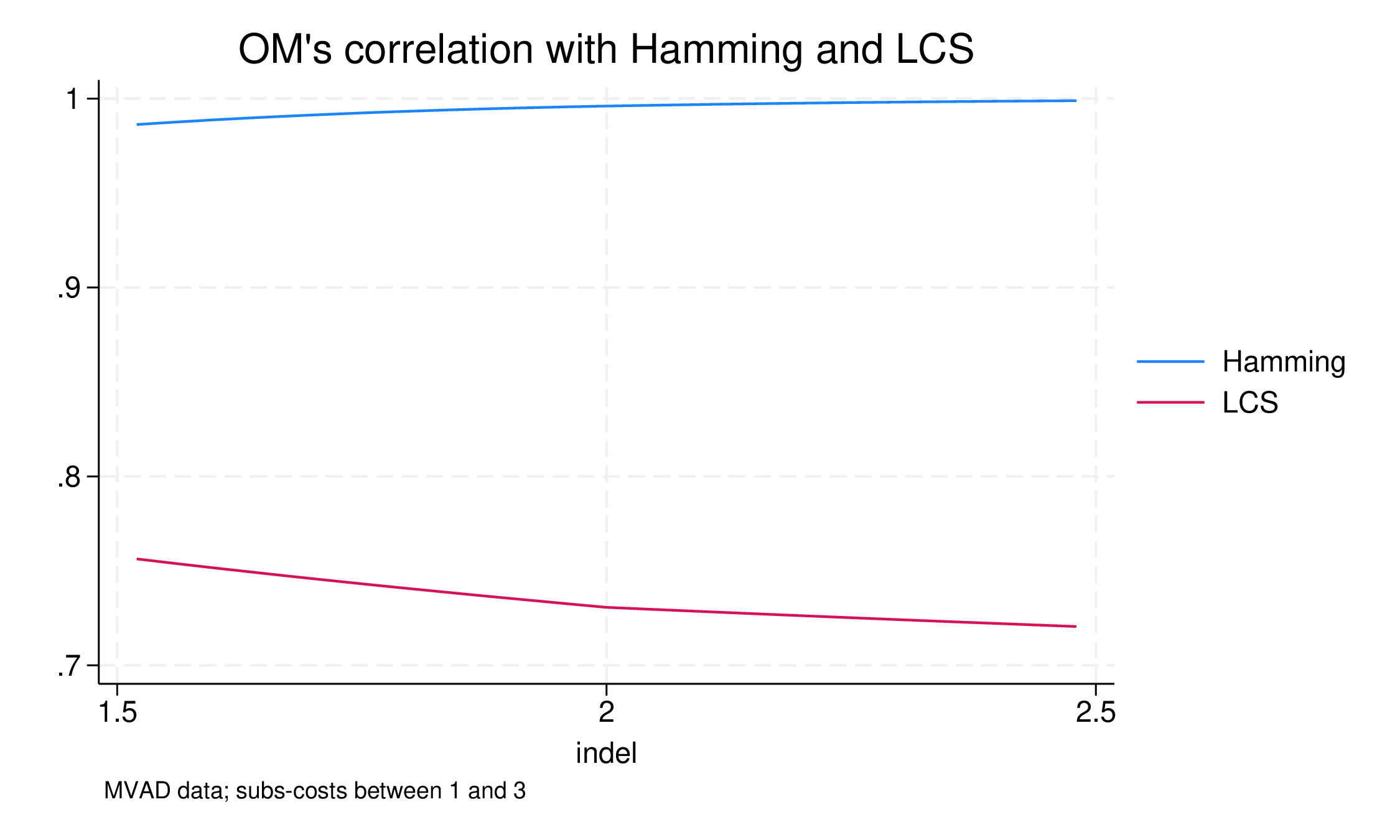 For the lowest values of indelcost, 0.0 to 0.5, the results are the same. The correlation between OM and LCS is 1.0, in other words, the results are identical, despite the different substitution matrices. This is to be expected, but it is nice to demonstrate that if the indelcost is less than or equal to the minimum substitution cost, substitutions are ignored. In this range the correlation with Hamming is 0.72.