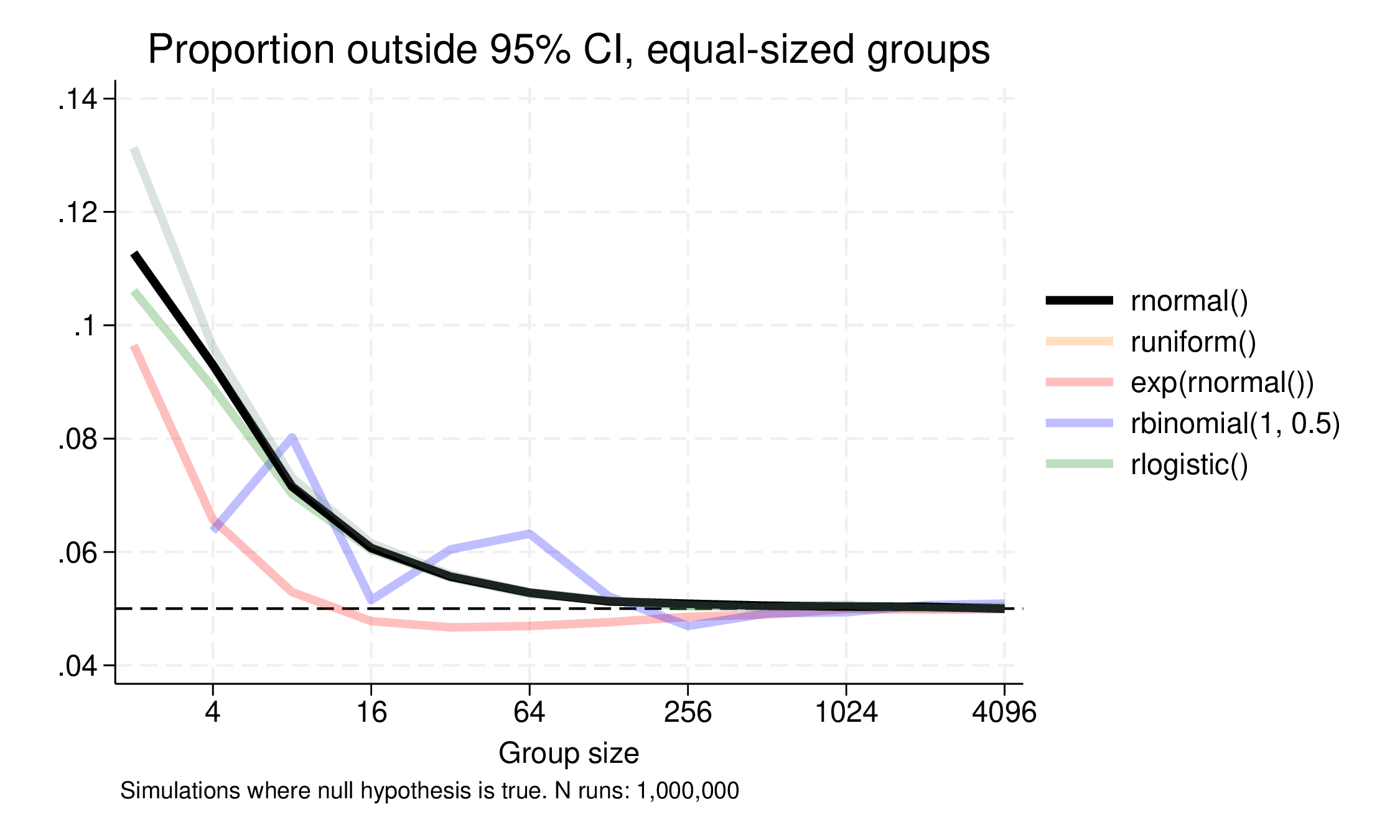 To test this, I created a small simulation in Stata: it creates data where the null hypothesis is true, i.e., groups A and B are drawn from the same (specifiable) distribution, and then runs a t-test on the A-B difference. We do this repeatedly, and count how often the confidence interval around the estimate contains the true value. If approximately 2.5% of cases fall below the 95% interval and 2.5% above, performance is good; otherwise it is problematic.